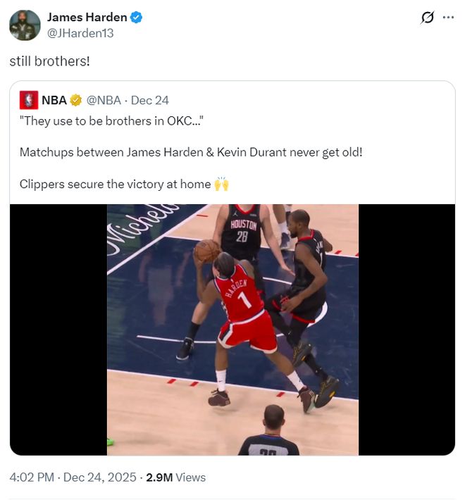 賽后NBA官方曬出哈登單打杜蘭特的瞬間寫道:兩人以前是兄弟!哈登轉推回應:我們現在也是兄弟。