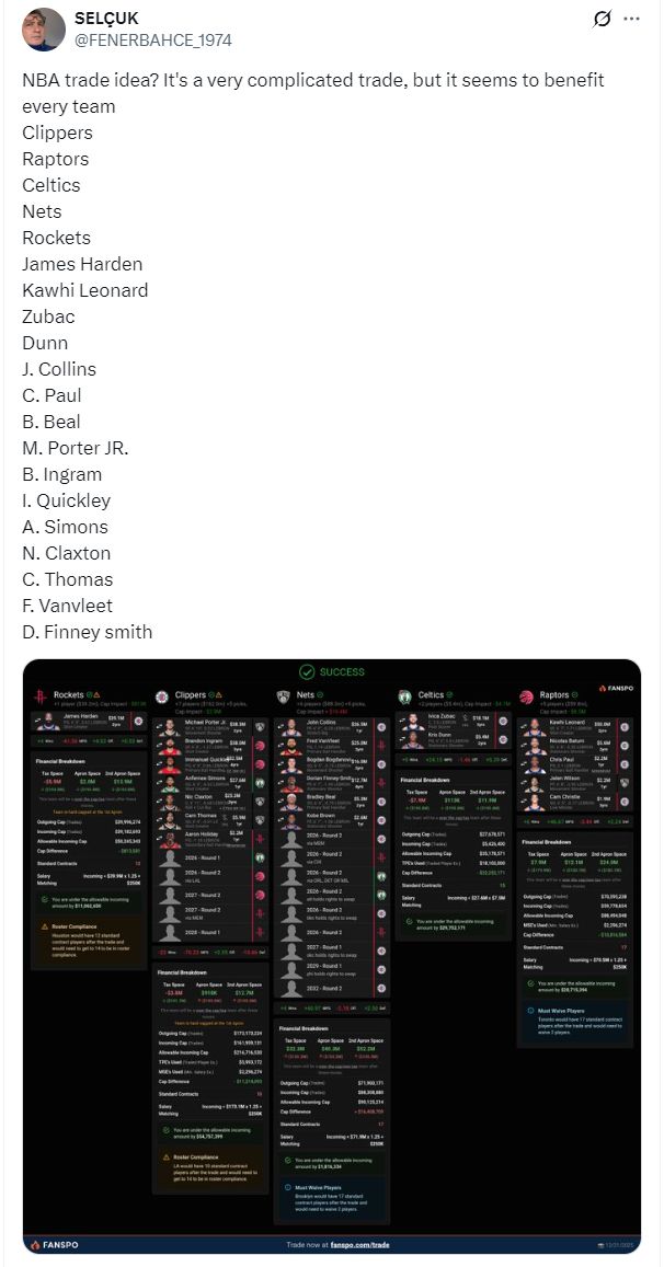 一位快船的球迷則覺得幫助哈登重返休斯頓的過程中LAC也可以直接重建,畢竟快船本賽季要實現泰倫盧所說的55場比賽贏下35場實在是太難,本賽季提前重建對未來更有益處,他模擬了一套超級五方交易,這筆交易涉及了多個選秀權。