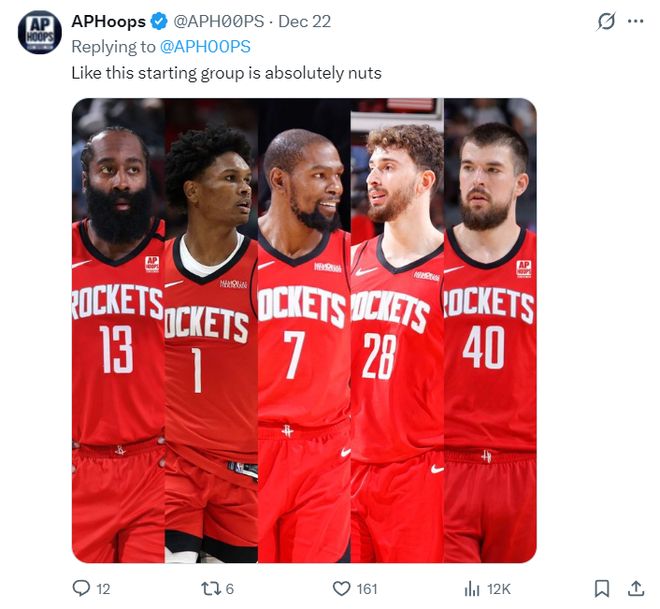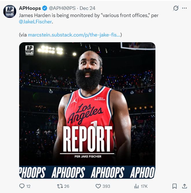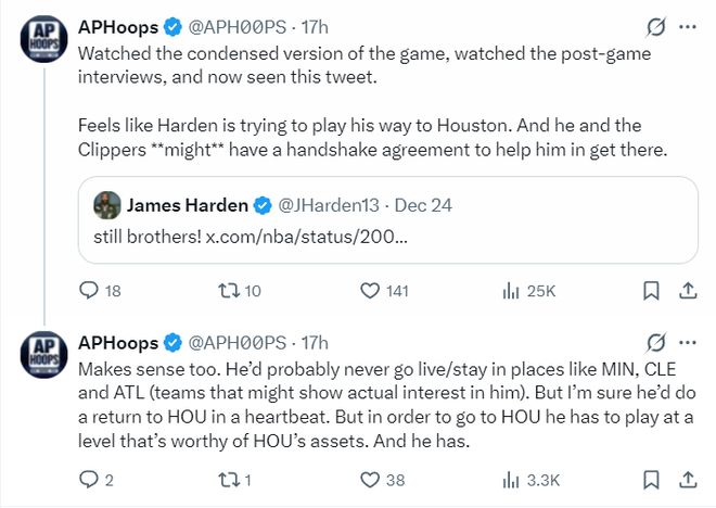 快船媒體APHoops賽后也轉發了哈登說自己跟KD現在也是兄弟的推文,他寫道:觀看了比賽后哈登簡短的采訪,現在又看到了哈登這條推文,感覺哈登似乎在努力憑借自己的努力重返休斯頓,而且他跟快船之間似乎存在某種默契,都在努力送哈登回火箭。