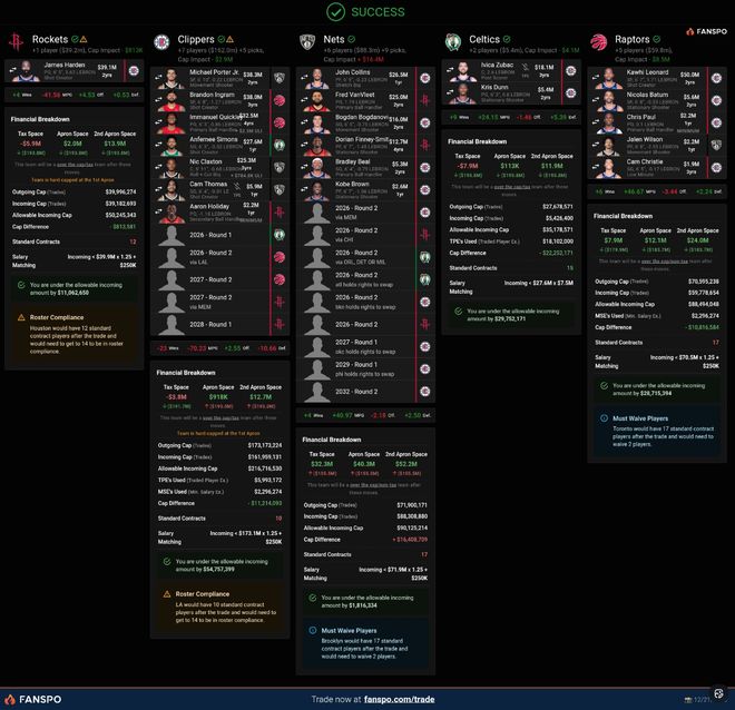 船媒支持哈登重返火箭!快船球迷模擬5方大交易:卡登祖全出重建