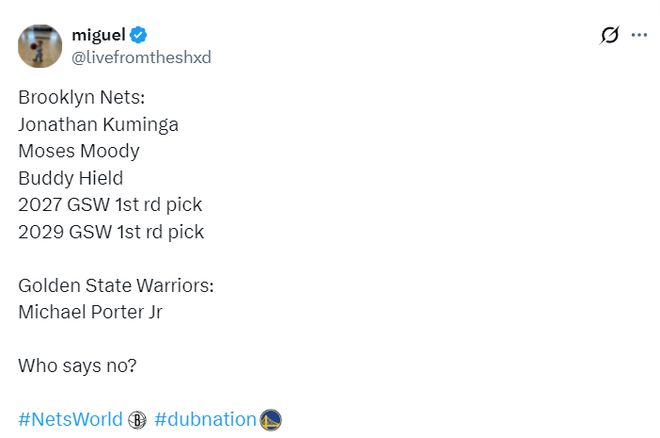美媒Miguel為籃網(wǎng)、勇士設(shè)想了一筆交易方案: