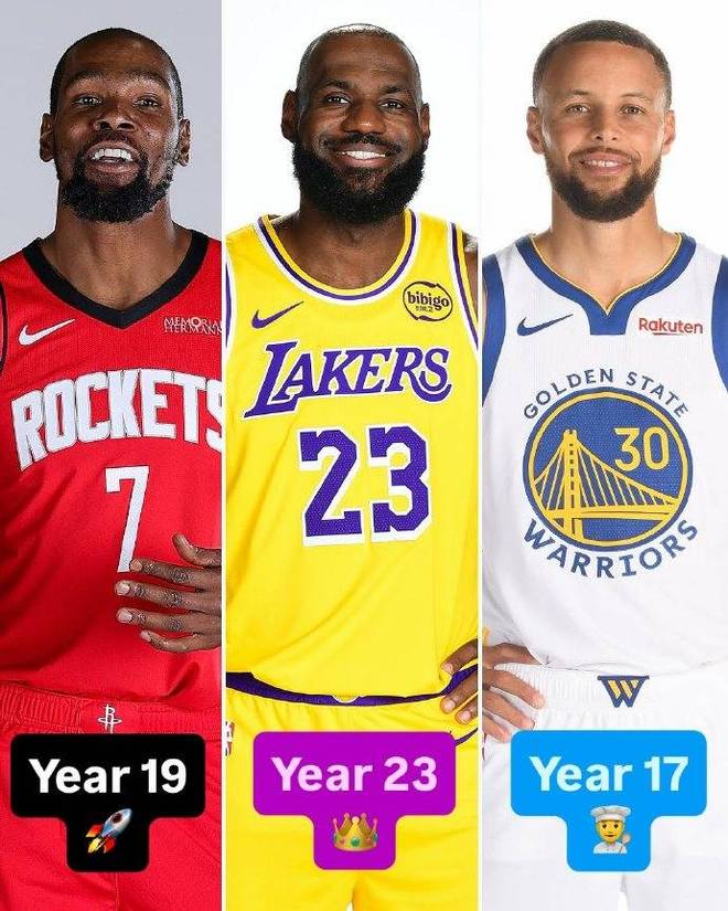 本賽季,詹姆斯、杜蘭特、庫里這三位已經(jīng)步入生涯末期的超級巨星分別迎來了個人生涯第23、第19、第17個賽季,他們的年齡也都已經(jīng)超過35歲。其中詹姆斯還有幾天就即將迎來41歲生日,杜蘭特和庫里也都已經(jīng)年滿37歲。