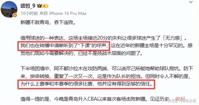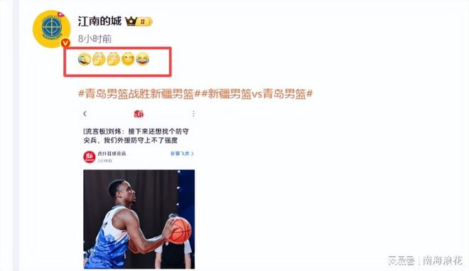 別跑剛背豬說,“為啥新疆隊這個感覺怎么越來越魔幻了。外援選防守尖兵,又要有得分的話,代價很大的吧”這位媒體人說的是,你要選防守尖兵式的外援,那進攻端付出的代價不是更大嗎?而江南的城則轉(zhuǎn)發(fā)劉煒發(fā)言,并用“允悲”、“偷笑”等表情給予嘲笑,也就是說眾多的媒體人并不認同劉煒賽后的發(fā)言。