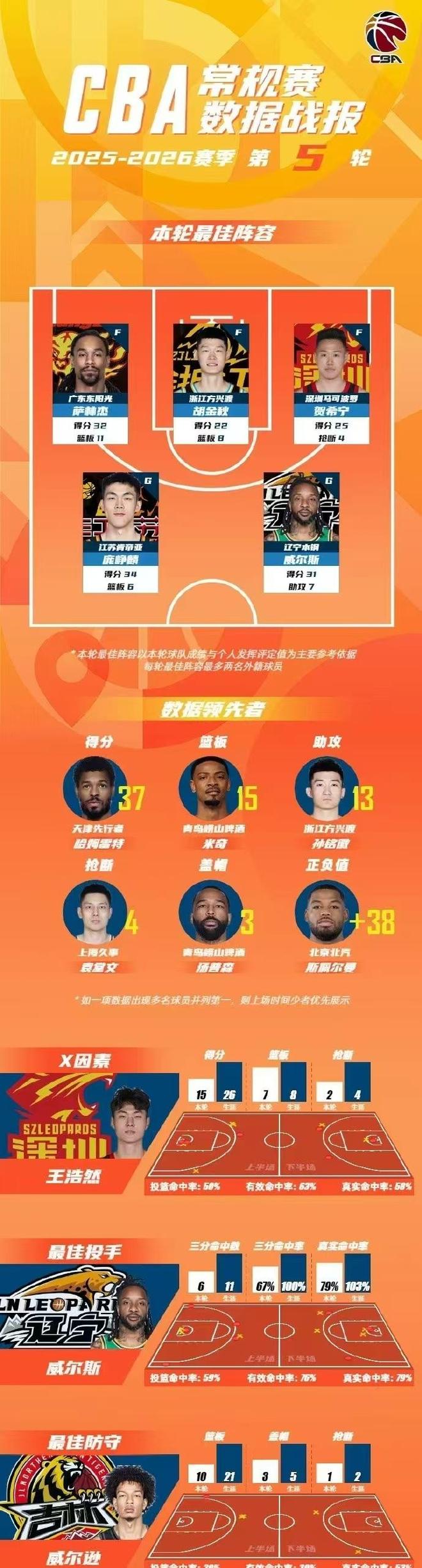 CBA官宣常規賽第5輪最佳陣容,新科探花龐崢麟34+6創生涯得分紀錄,也是再次刷新本屆新秀單場最高分紀錄領銜入選,薩林杰32+11與威爾斯31+7入選,胡金秋22+8與賀希寧25分也上榜。