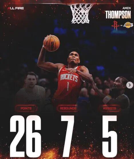 上半場結束前,伊森快攻暴扣打進,杜蘭特跳投得分,火箭63-53領先湖人。