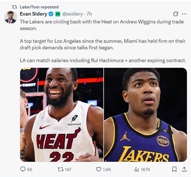 根據NBA記者埃文-斯迪瑞寫道:湖人隊已經重啟了跟熱火隊的談判,湖人依舊想要得到安德魯-威金斯。自今夏開始,湖人一直都在努力的交易得到維金斯,但邁阿密一直要求得到未來選秀權與年輕資產,湖人希望用八村壘+添頭去換威金斯,這使得交易陷入僵局。