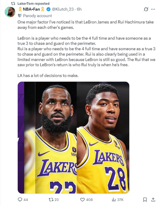湖媒NBA-Fan還拋出一個論點:詹姆斯與八村壘同時上場會相互制約,但球隊沒有任何改變。詹姆斯需要長期打四號位,八村壘同樣需要長期打四號位,這兩人都需要一位真正的三號位幫助他們拉開空間/防守,詹姆斯復出后嚴重制約八村的發揮,因為41歲的勒布朗依舊出色,可八村壘也是無法防三號位的PF。