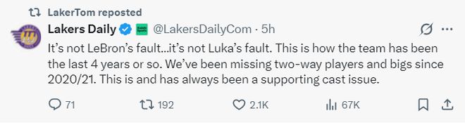 北京時間12月27日晨,湖媒Lakers Daily發聲:這不是詹姆斯的錯也不是東契奇的錯,過去四年湖人一直都是這個樣子,從20-21賽季開始我們就缺少攻防雙向球員與中鋒,替補陣容的問題尤為明顯。