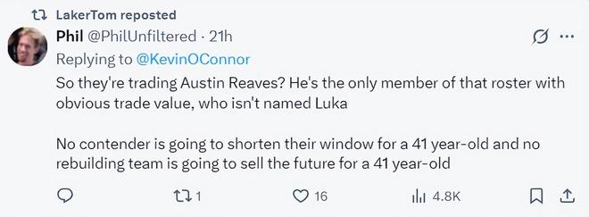 凱文-奧康納在播客中說道,湖人的非賣品實際上只有東契奇,41歲的詹姆斯沒有任何交易價值,湖人也不是圍繞41歲的勒布朗建隊,所以湖人要真的改善陣容只能交易奧斯汀-里夫斯。