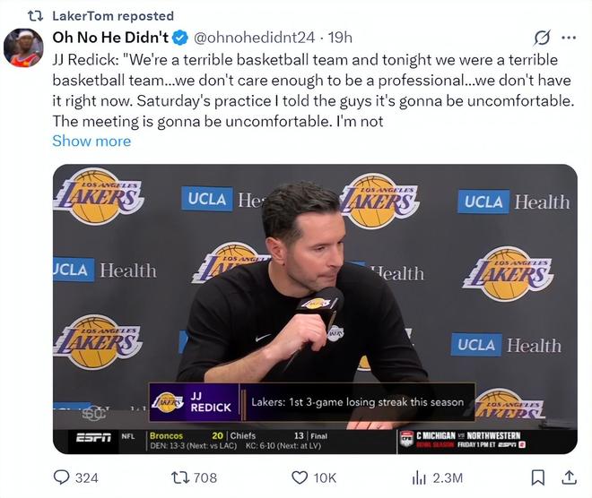 在湖人慘敗火箭賽后雷迪克暴怒,他直指隊內某些球員的工作做得不到位,而且沒有贏球的欲望,說一套做一套,雷迪克的言論讓湖人內部的矛盾擺上臺面。很多球迷開始炮轟詹姆斯、東契奇、里夫斯、艾頓、八村壘、雷迪克。