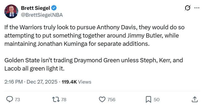 根據名記Chris Haynes報道,勇士隊正在考慮一筆風險極大的交易方案,嘗試追求10次入選全明星的獨行俠大前鋒濃眉哥。