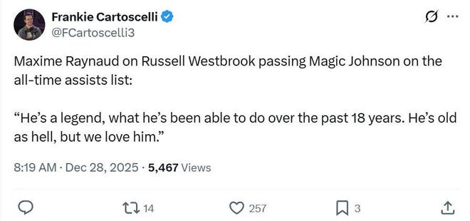 其次是威少生涯總助攻數超越魔術師約翰遜獨占NBA歷史第七。