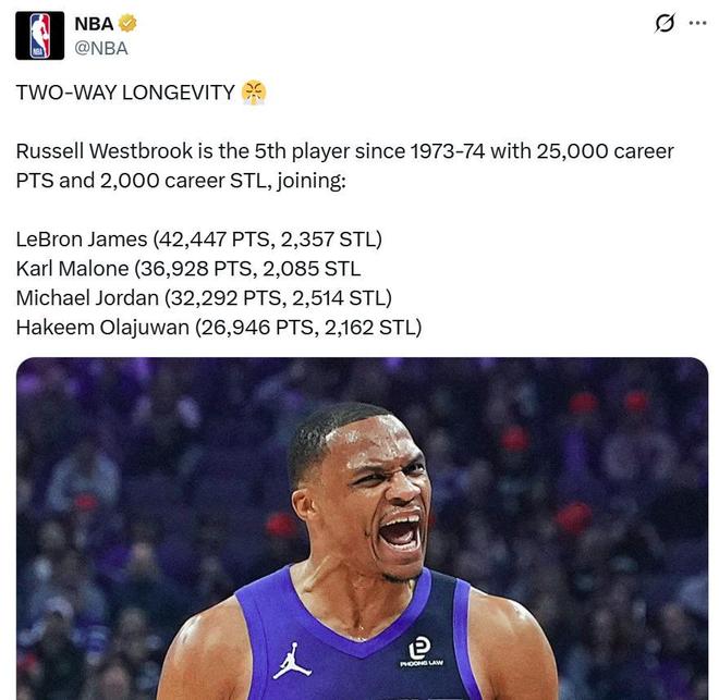 除此之外,威少在本場比賽之后也成為NBA歷史上第二位能夠拿到至少25000分2000次搶斷的后衛球員,第一人是籃球之神喬丹。