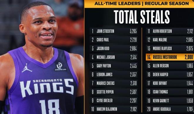 憑借這樣的表現,威少一戰迎來兩大里程碑,首先是搶斷總數突破2000大關,成為NBA歷史上第14位完成這一壯舉的球員。