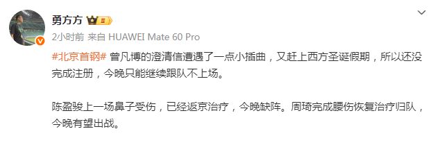 除此之外,曾凡博雖然已經完成續約一個多禮拜,但他的澄清信手續依然沒有完成,尤其是趕上西方的圣誕假期,導致他依然沒有完成注冊,將繼續缺席對陣福建男籃的比賽。