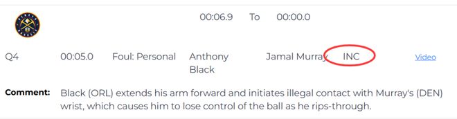 唯一的漏判出現在距離比賽結束還有5秒,裁判報告指出魔術隊的布萊克在防守時伸手向前,與掘金隊的穆雷手腕發生非法接觸,這一動作導致穆雷在持球突破過程中失球。這是一次漏吹的防守犯規,由于當時雙方犯規次數都已滿,這次犯規本該讓穆雷獲得兩次罰球機會。