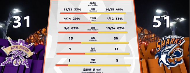 廖三寧再次登場(chǎng)后手感仍然冰涼,而與此同時(shí)的大鯊魚則不斷利用籃板球制造威脅。半場(chǎng)比賽結(jié)束,上海隊(duì)51-31,遙遙領(lǐng)先!