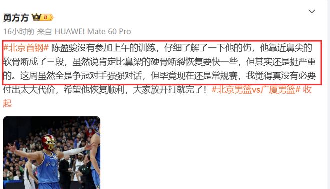 下一場京粵大戰,陳盈駿很可能還是打不了,據北京隊記勇方方的報道,陳盈駿的鼻骨骨折傷情不是太樂觀,靠近鼻尖的軟骨斷裂成3段,挺嚴重,29號剛做完手術,目前隊醫還無法給出明確的復出時間,況且,即便陳盈駿能在明晚火速復出,恐怕在戴上面具后也會影響到手感。