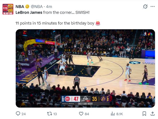 這場(chǎng)比賽是勒布朗-詹姆斯41歲的生日夜,詹姆斯生日夜場(chǎng)均32.9分7.1籃板6.9助攻,命中率55.5%,戰(zhàn)績(jī)是5勝5負(fù),他是歷史生日夜場(chǎng)均得分最高的球員。