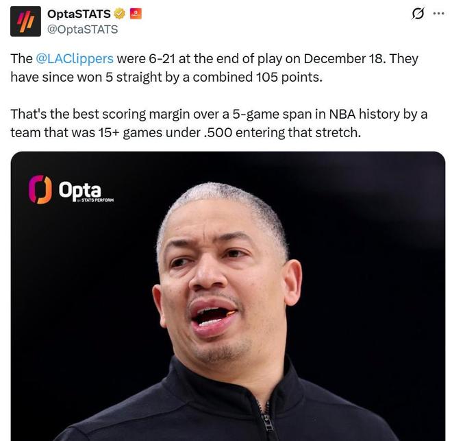 憑借這樣的表現,快船隊不僅拿下現存最長的5連勝,還成為NBA歷史上50%勝率以下(至少15場)球隊5連勝的凈勝分新紀錄,過去5場比賽快船隊凈勝105分。