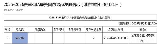 北京時(shí)間今日,CBA官網(wǎng)的注冊(cè)信息顯示,曾凡博已經(jīng)在北京北汽的注冊(cè)名單中。