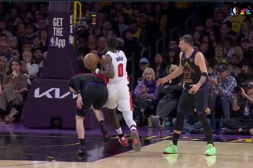 在這個回合中,活塞中鋒杜倫碾著拉拉維亞強突籃下,此時在側翼站位的東契奇并沒有選擇協防,只是目送杜倫攻筐,并攤開雙手示意裁判杜倫進攻犯規。最終裁判未予吹罰,杜倫順利得分。