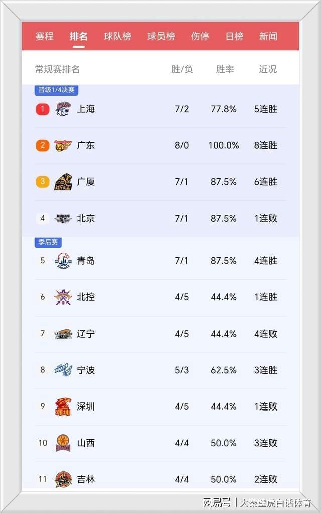 隨著這場比賽的結束,遼寧男籃前9輪只拿到4勝5負的戰績,勝率首次跌至五成以下,而拿到5連勝的上海男籃,則是憑借多賽一場的優勢,以7勝2負的戰績暫時沖上榜首寶座。