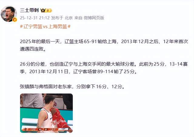 北京媒體人三土帶刺老師則表示:2025年的最后一天,遼籃主場65-91輸給上海,2013年12月之后、12年來首次遭遇四連敗。26分的分差,也創(chuàng)造遼寧與上海交手間的最大輸球分差。此前為25分,13-14賽季,2013年12月11日,遼寧客場曾89-114輸了25分。張鎮(zhèn)麟與弗格面對老東家,分別拿下16分、12分。