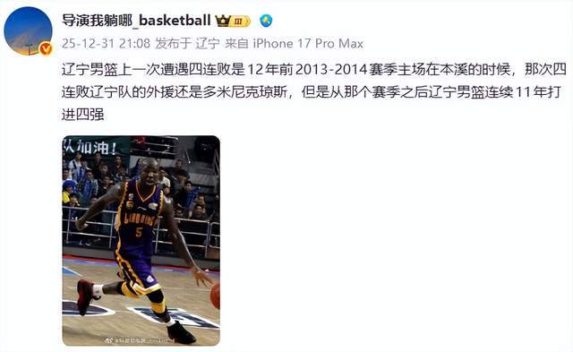 另一位遼寧媒體人導(dǎo)演我躺哪則表示:遼寧男籃上一次遭遇四連敗是12年前2013-2014賽季主場在本溪的時候,那次四連敗遼寧隊的外援還是多米尼克瓊斯,但是從那個賽季之后遼寧男籃連續(xù)11年打進(jìn)四強
