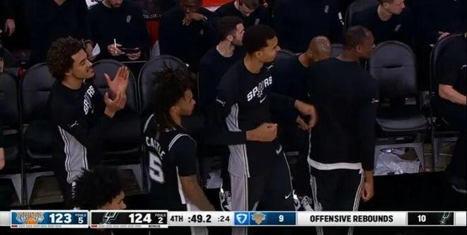 比賽最后時刻,從不輕言承諾的文班言出必行,經過治療后,重新回到了替補席,看起來并無大礙。