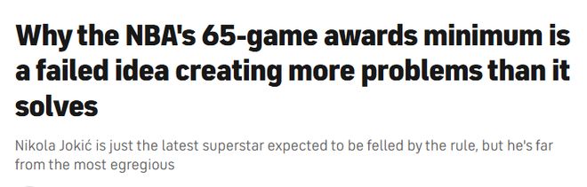 現在,有些球迷抱怨說,65場規則之所以引發熱議,只是因為約基奇錯失了贏得第四座MVP獎杯的機會。但實際上,這與約基奇本人毫無關系。無論有沒有這條規則,他的傷勢都為亞歷山大鋪平了MVP的奪冠之路。除非亞歷山大也遭遇傷病,否則65場規則幾乎不會影響MVP的歸屬。