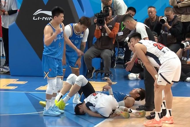 上半場首鋼隊憑借多點開花的模式57比31領先,徐杰在次節慘遭周琦倒地撞傷膝蓋被隊友背離球場接受治療。