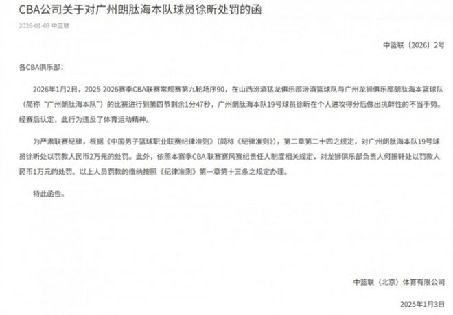 為嚴肅聯賽紀律,根據《中國男子籃球職業聯賽紀律準則》第二章第二十四條規定,對徐昕處以罰款2萬元的處罰。此外,依照本賽季CBA聯賽賽風賽紀責任人制度相關規定,對廣州男籃俱樂部負責人何振軒處以罰款1萬元的處罰。