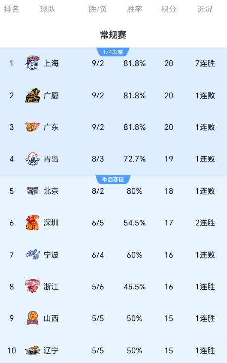 隨著廣廈22分輸上海,廣東遭浙江絕殺,CBA最新積分榜:榜首易主