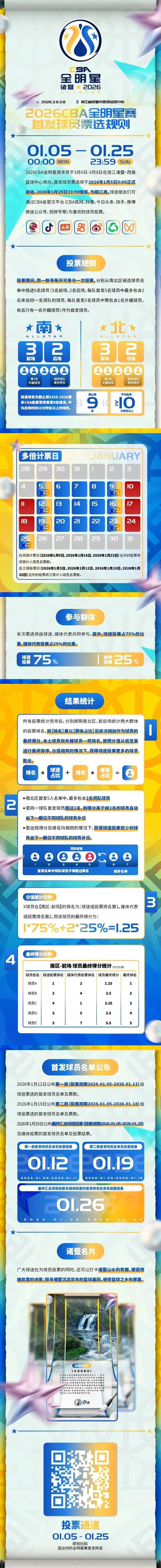 2026年CBA全明星將于3月6日-3月8日在浙江諸暨舉辦。2026CBA全明星賽首發球員票選通道今日開啟!投票開放時間為1月5日0:00起至1月25日23:59止,為期3周。同一賬號每日可進行1次投票,每日0點刷新投票機會,本屆全明星賽的首發名單就將于1月26日將揭曉,其中, 1月5日、12日、19日、25日為三倍計票日,1月9日、16日、23日為雙倍計票日。