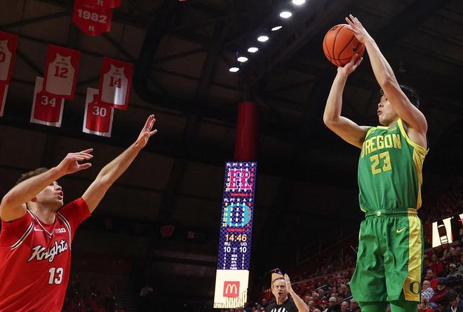 出戰(zhàn)33分鐘,14投8中,三分球12中6,罰球2中1,轟下23分1籃板5助攻2搶斷,林葳不經(jīng)意間迎來(lái)了NCAA生涯之夜,他的上場(chǎng)時(shí)間、得分、助攻、搶斷、三分命中數(shù)都創(chuàng)造了新高。1月6日,俄勒岡大學(xué)歷經(jīng)加時(shí)賽以85比88不敵羅格斯大學(xué),林葳在這一戰(zhàn)表現(xiàn)神勇。