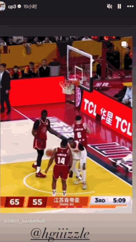 保羅在自己的INS限時動態里轉發了目前效力于江蘇隊的前NBA潛力股賈爾斯的勁爆扣籃動態。