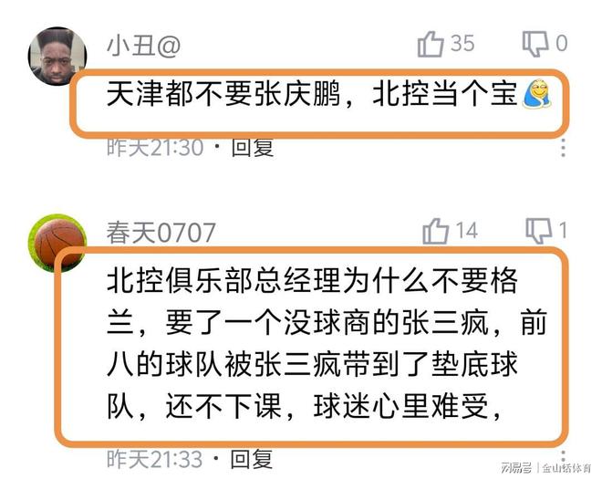 “北控這賽季怎么了?上賽季還打到了季后賽第二輪,這賽季到現在沒進季后賽?!?;“有前途,可能是個好球員,但是不一定是個好教練?!?;“張慶鵬不適合當教練?!?;“北控臉都不要了,再輸就只能輸四川了,然后沒得輸了。”;“張慶鵬在場外明顯心慌了,影響了場上隊員的情緒?!保弧霸?0分鐘的一節里還能丟40分真的神了。”;“北控沒錢找個好點的主教練嗎?”……