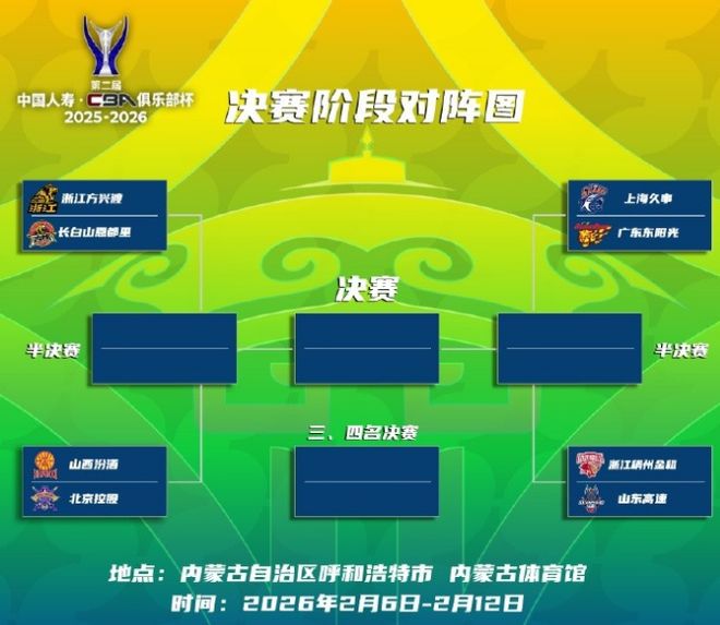 CBA官方公告寫道:“第二屆CBA俱樂部杯決賽階段揭幕戰,定于2月6日16:00打響,2月12日19:30進行總決賽,期間八強球隊浙江、山東、上海、廣東、廣廈、吉林、山西、北控將在內蒙古自治區呼和浩特市,按照對陣進行單敗淘汰賽(共8場比賽),按排名辦法最終產生本屆杯賽所有名次。”