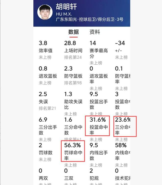 現在網絡上流傳一句話:廣東隊也有一個“高鐵”,甚至比山東高鐵還離譜。不說不知道,一查嚇一跳。經過查看數據,胡明軒本賽季真的是比山東高鐵還離譜。高詩巖的三項命中率是41%、37%、68%,而胡明軒是31%、23.6%、56.3%,投籃命中率、三分命中率和罰球命中率都比山東高鐵低。你難以想象,頂薪球員和隊長的罰命中率不到6成,三分命中率只是2成多。胡明軒本賽季真是中了邪了。