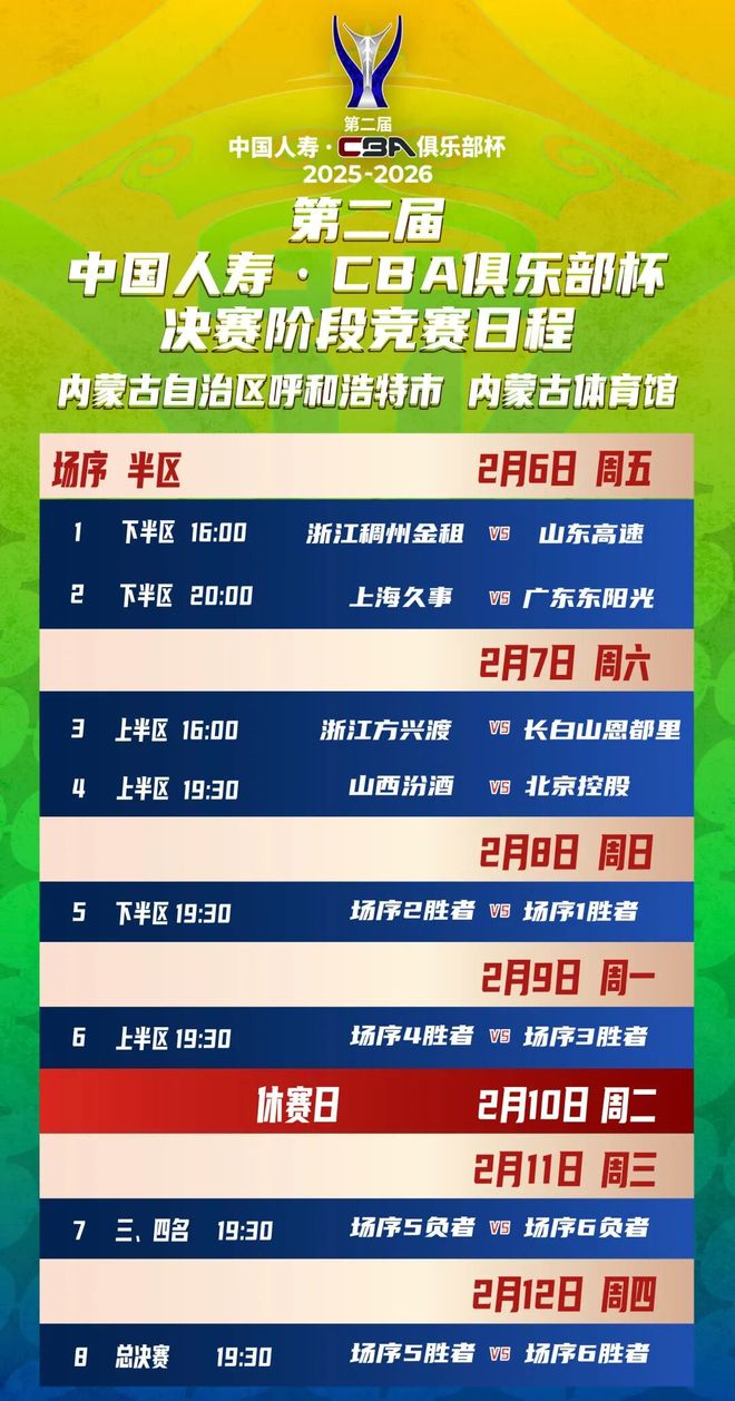 今天下午,CBA聯賽官方也發布了本屆CBA俱樂部杯決賽階段的競賽日程。上海久事男籃將在2月6日晚間對戰廣東東陽光男籃。