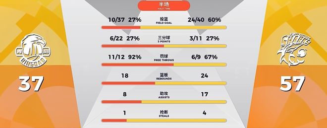 青島男籃的投籃命中率很低僅有11.1%,并且在籃板球方面6-17大幅落后上海男籃。首節比賽結束,上海男籃33-8領先青島男籃25分。