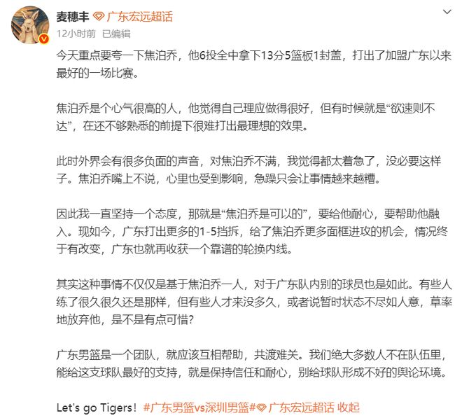 “此時外界會有很多負面的聲音,對焦泊喬不滿,我覺得都太著急了,沒必要這樣子。焦泊喬嘴上不說,心里也受到影響,急躁只會讓事情越來越糟。”麥穗豐繼續寫道。