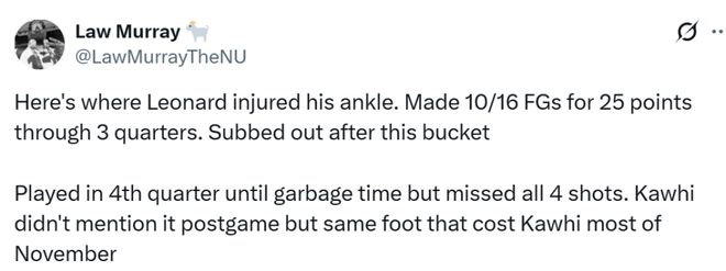 據快船隊記Law Murray報道,小卡的腳踝受傷發生在昨日對陣尼克斯比賽的第三節中段,萊昂納德在一次投籃后踩到了一位坐在場邊的球迷的腳,他在前三節16投10中,拿下25分,在這次得分后就被換下場。