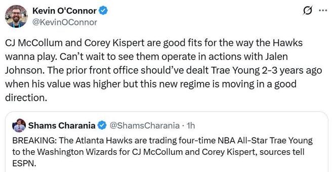 名記Shams在后續報道中指出,老鷹隊之所以如此廉價賣掉特雷楊,提升薪金靈活性以在交易截止日前引進另外一名頂薪球員是重要原因之一,而濃眉哥是他們的頭號目標。