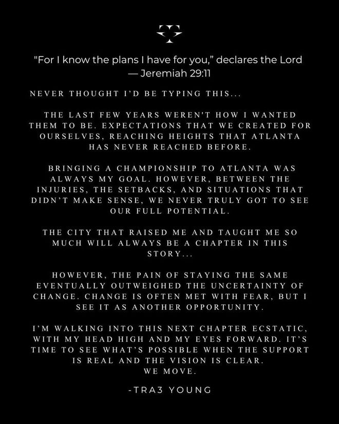 特雷-楊寫道:“為亞特蘭大帶來總冠軍一直是我的目標。然而,傷病、挫折以及種種不合理的情況交織在一起,我們始終未能真正發(fā)揮出全部潛力。這座培養(yǎng)我、教會我很多東西的城市,永遠會是我人生故事中的重要一章。”