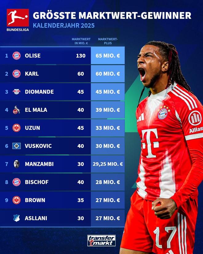 本周,德轉盤點了德甲球員2025年身價上漲數據,拜仁邊鋒奧利塞本年度身價上漲6500萬歐,高居榜首。小將倫納特-卡爾、揚-迪奧曼德、賽義德-馬拉進身價上漲榜前十名。
