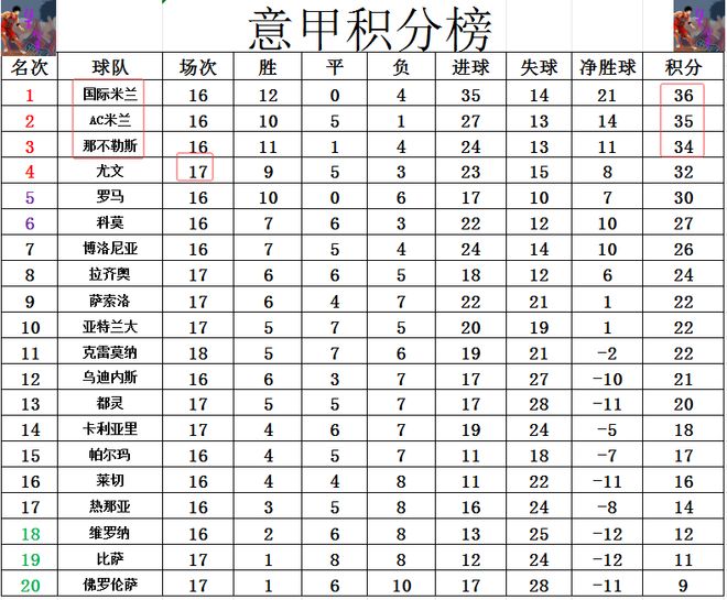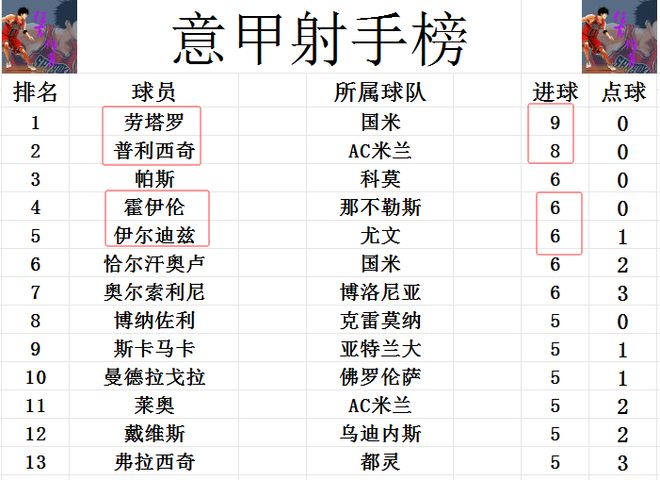 射手榜方面,勞塔羅打入制勝球,9球繼續領跑射手榜,射手榜第2也是AC米蘭,而且普利西奇也只差勞塔羅1球?;粢羵惷烽_二度,追上伊爾迪茲,恰爾汗奧盧和奧爾索里尼,6球并列第3。