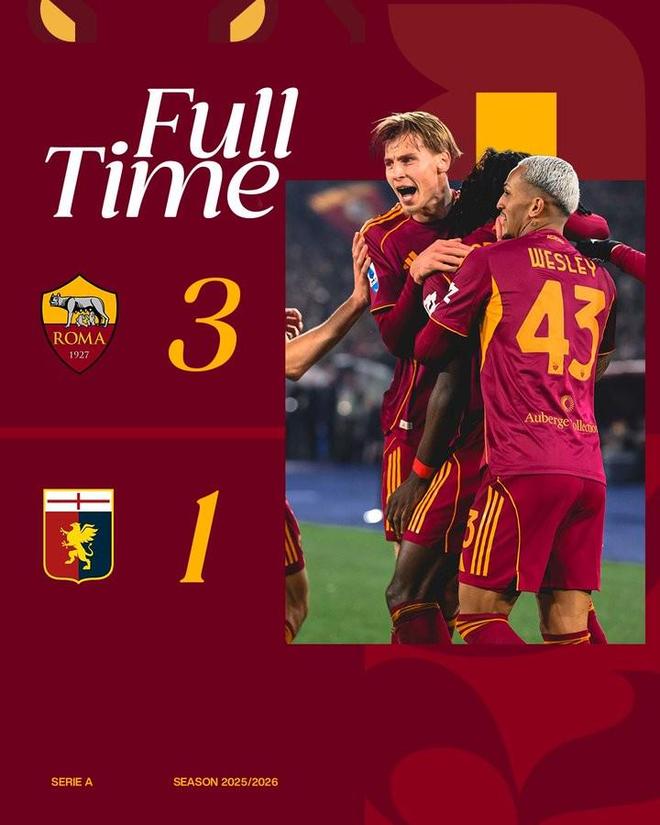 北京時間12月30日,在意甲第17輪的比賽中,羅馬依靠馬蒂亞斯-蘇萊、夸迪奧-科內以及埃文-弗格森的進球主場3-1擊敗熱那亞,排名重回積分榜第四位。