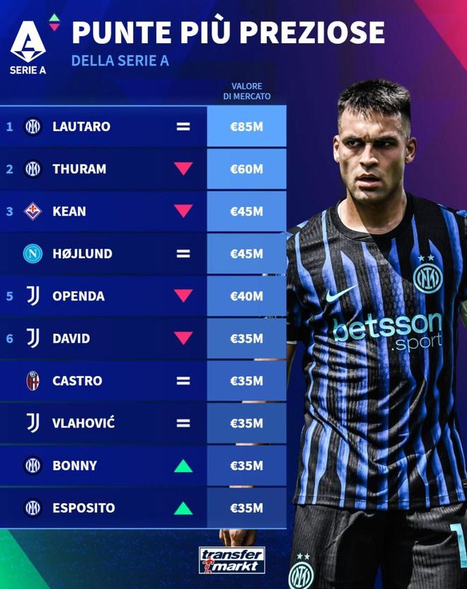 德轉列意甲中鋒身價前10:勞塔羅8500萬第1,霍伊倫4500萬第3